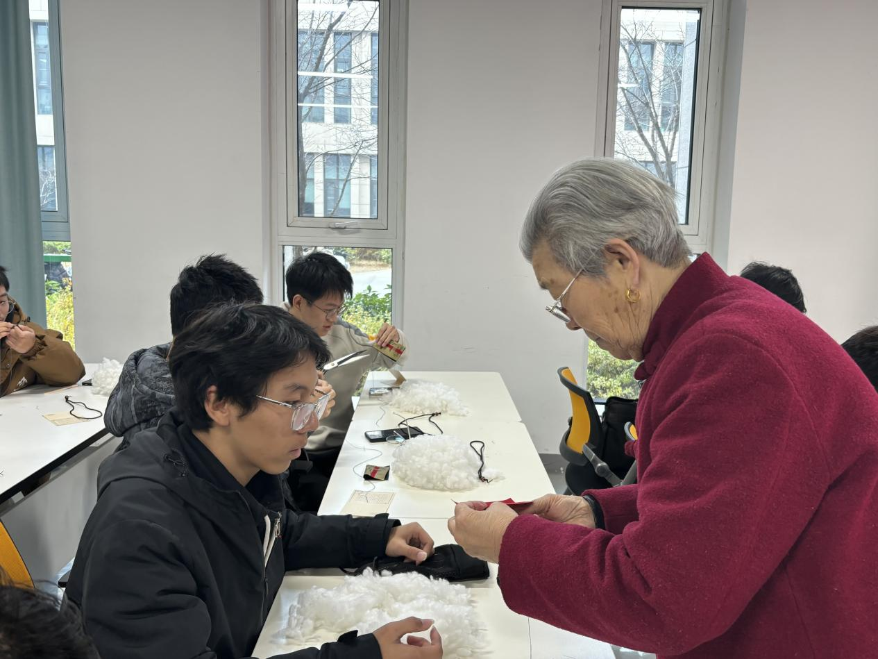 孙亚云教授从专业角度系统阐述了徐州香包的艺术特色与文化内涵,并分享了其团队围绕非遗香包开展的劳育实践探索。她结合本次特制的香包布料,生动讲述了学校搬迁历程,以实物为载体深化校情校史教育。王秀英女士则亲切讲述了她与徐州香包相伴多年的故事,寄语同学们在学习与生活中保持热爱、持之以恒。在动手制作环节,同学们穿针引线、悉心缝制,从布料缝合、棉絮填充到加入精心调配的中草药香料,逐步完成独一无二的香包作品。制作过程中,王秀英女士与孙亚云教授耐心指导、细致讲解,同学们沉浸在手工劳动的专注与宁静中,体验非遗魅力,活动现场洋溢着温馨与愉悦的氛围。