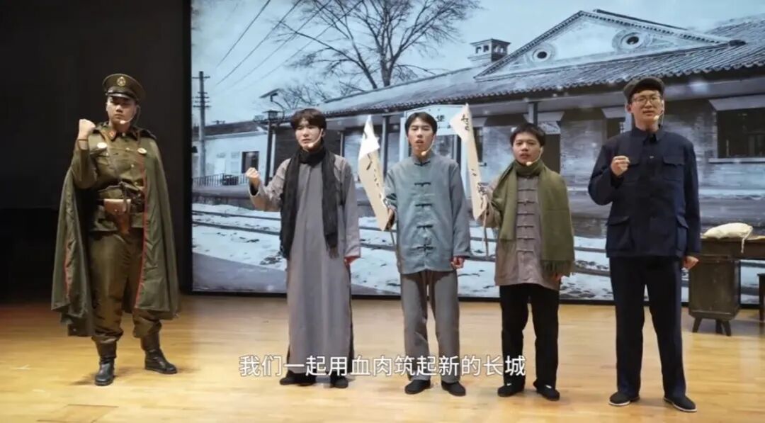 舞台之上,风雪呼啸的三堡站实景重现,光影交错间,九十余年前的爱国场景鲜活铺展。从起草《告民众书》时的热血激昂,到校友与车站站长的温情相助,再到面对阻挠者时的针锋相对,情节层层递进、扣人心弦。“哪里能摆下书桌”的振聋发聩之问、“愿上战场”的铿锵呐喊直击人心,最终以“我们一起用血肉筑起新的长城”的庄严誓言收尾,沉浸式的演绎让观众仿佛穿越时空,真切感受着先辈学子的坚毅信念与爱国热忱。