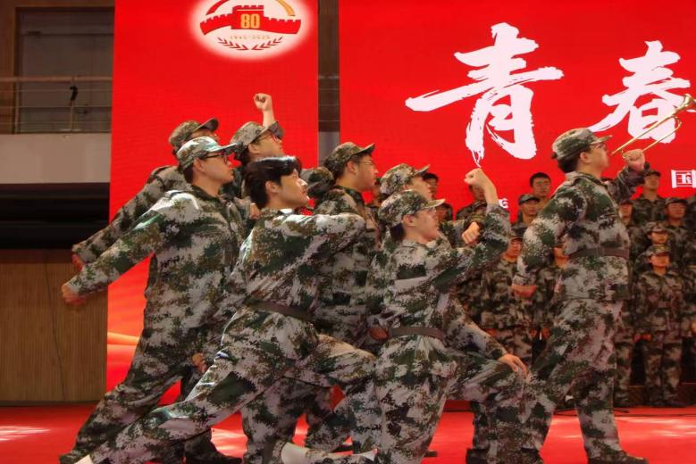 《胜利荣光》既是对军训生活的完美诠释,也是对革命先烈不畏牺牲、取得抗战胜利的热情讴歌。歌曲旋律激昂,京剧唱腔铿锵穿插,刚柔相济;同学们身姿挺拔,舞步刚劲有力,军训剪影闪过,汗水与坚毅历历在目。我院学子以歌声抒怀、用舞姿传情,满腔热血与赤诚尽在其中,既展现青春朝气,更传递对荣光的敬仰、对家国的热爱,昂扬气势感染全场。